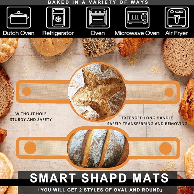 - [UNIQUE DESIGN OF LONG HANDLE] Enhanced safety with handles, The silicone bread sling that is used in a Dutch oven has sensible long handles on both sides. This design protects your hands from burns and makes it simple to remove the finished product. Flexible different silicone baking mat (2-pack) for various types and shapes of food(Oval and Round for Dutch Oven).
