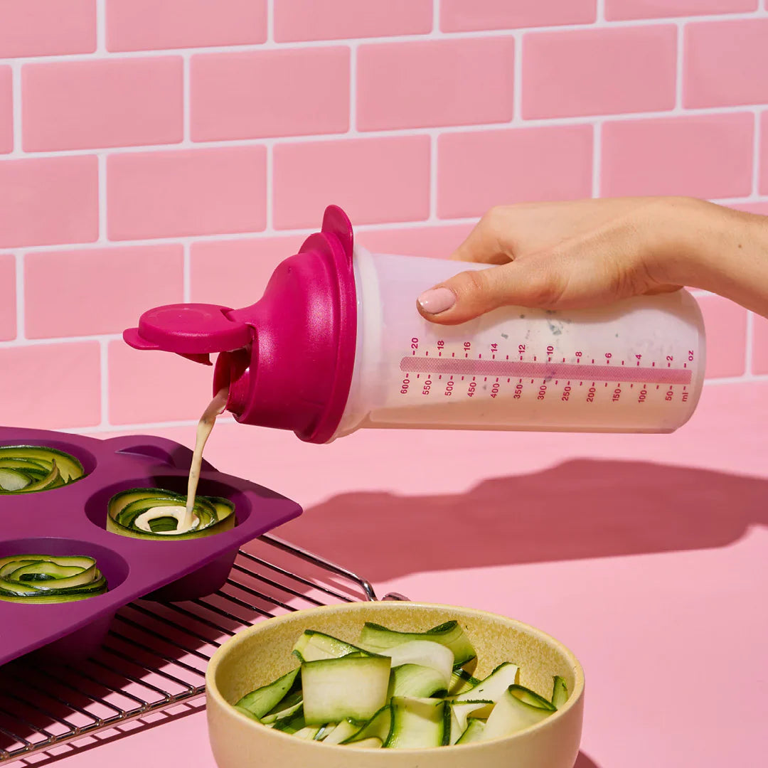 Our leak proof shake container is not only quick and convenient, it's also a secret multi-tasker. Use as a salad dressing shaker to make healthier homemade alternatives to store-bought dressings. Or use as a quick mix-and-measure container when making, mixing, serving, and storing marinades, liquid and dry ingredients without the mess and fuss of larger bowls or electric mixers. This clever shake container also features a specially-designed dripless seal that doubles as a measuring cup with markings inside