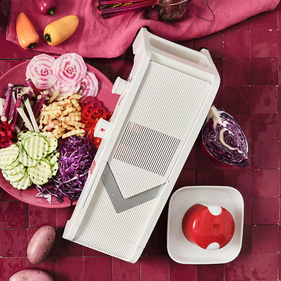 - Multiple blades: two detachable blades (straight, wavy) and two sets of built-in julienne blades (6 mm, 9 mm) for a multitude of cutting options